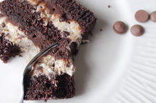 Pan de chocolate, relleno entre capas de Mousse de Vainilla y queso con compota de cerezas.
